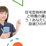 2024年10月25日 / 最終更新日時 : 2024年10月29日 wp-poster 介護・看護一般 住宅型有料老人ホームと特養の違いを知ろう!あなたに合った施設選びのポイント 住宅型有料老人ホームと特別養護老人ホーム(特養)の違いについて詳しく解説します。費用の違いや介護サービスの提供方法、自由度の面での特徴など、選び方のポイントを紹介。自立したい方や介護が必要な方、それぞれのニーズに合った施設を選ぶための重要な情報をお届けします。どちらの施設が適しているか悩んでいる方必見です。